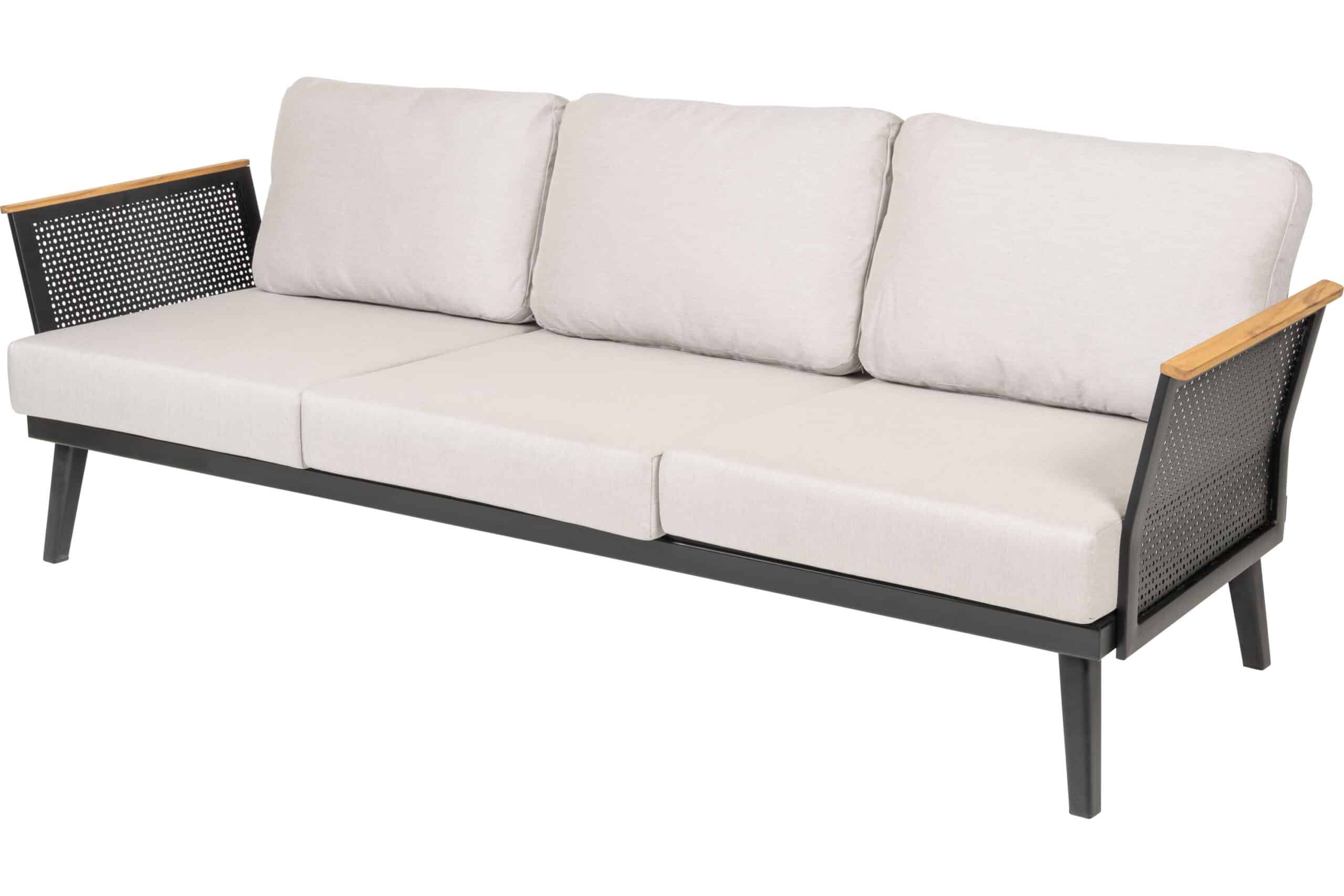 Møblene er komfortable med høy sittekomfort og de løse putene er trukket i lysegrått Olefin. Olefin er et værbestandig og slitesterkt tekstil som er enkelt å vedlikeholde. Sofagruppen har sortlakkerte aluminiumsrammer med firkantede profiler og mesh- detaljer på rygg og armlener. Øverst på armlenene er det teak som tilfører møblene en naturlig varme.