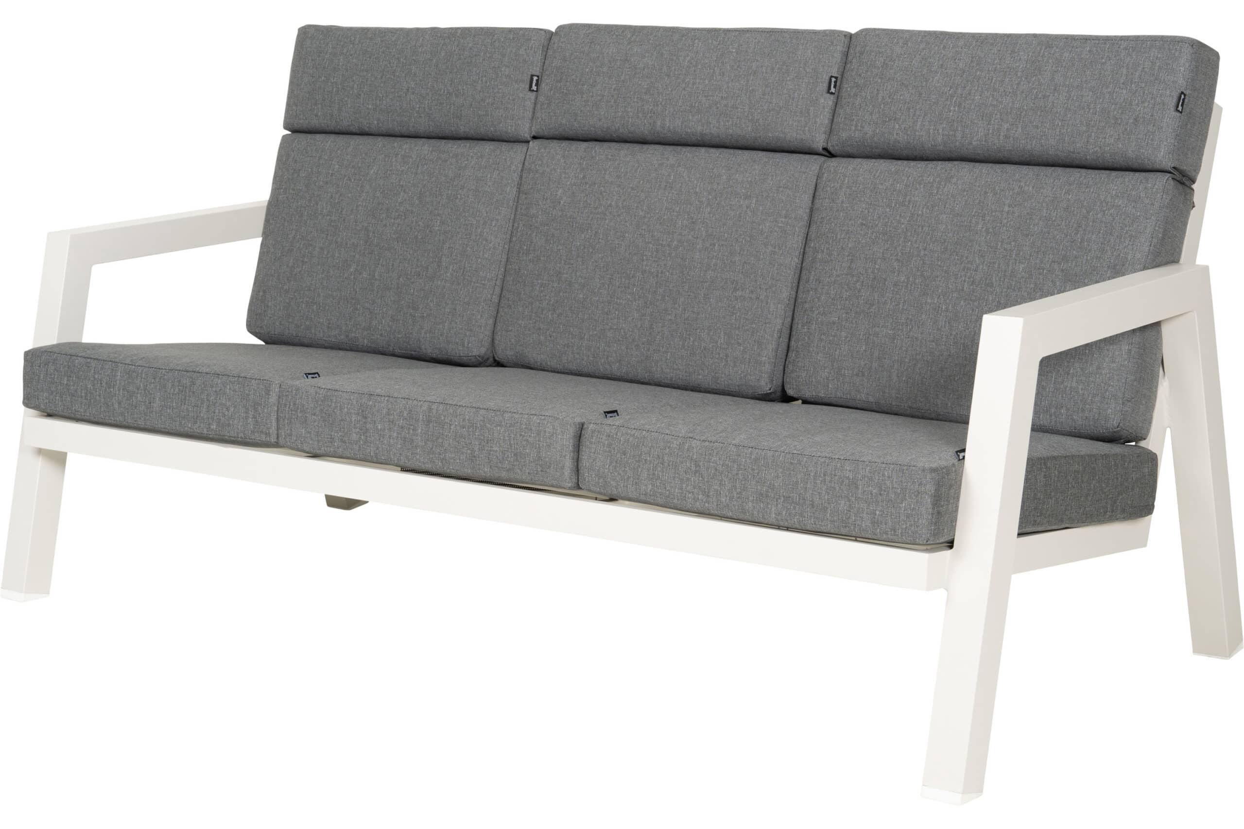 3-seter sofa og sofastol i moderne og robust design. Ramme i hvitlakkert aluminium og komfortable puter i lysegrå olefin. Tåler varierte værforhold og er enkel å rengjøre. Sofabord med ramme i hvitlakkert aluminium og bordplate i keramisk flis.