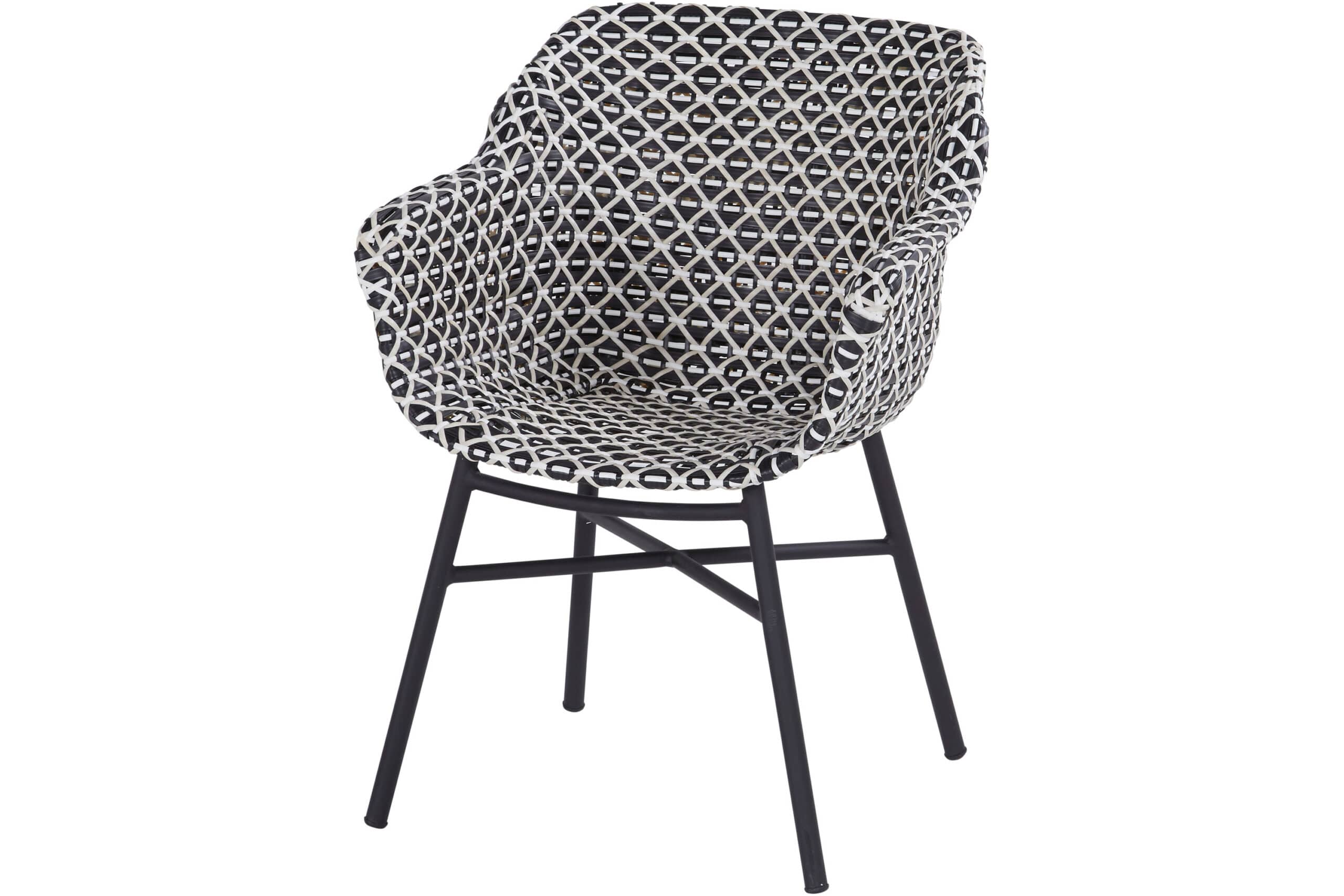 Unik og vakker spisestol i sort og hvit kunstrotting – Delphine er lite kunstverk i seg selv! Bensett i sortlakkert aluminium. Værbestandig og enkel å rengjøre.