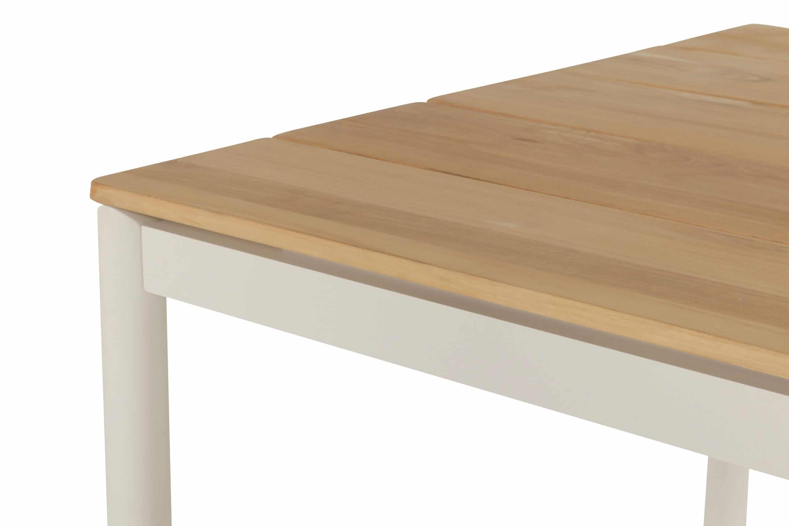 Tidløst og elegant spisebord med ramme i hvitlakkert aluminium og bordplate i FSC-sertifisert teak. Passer perfekt med Fontaine spisestol.
