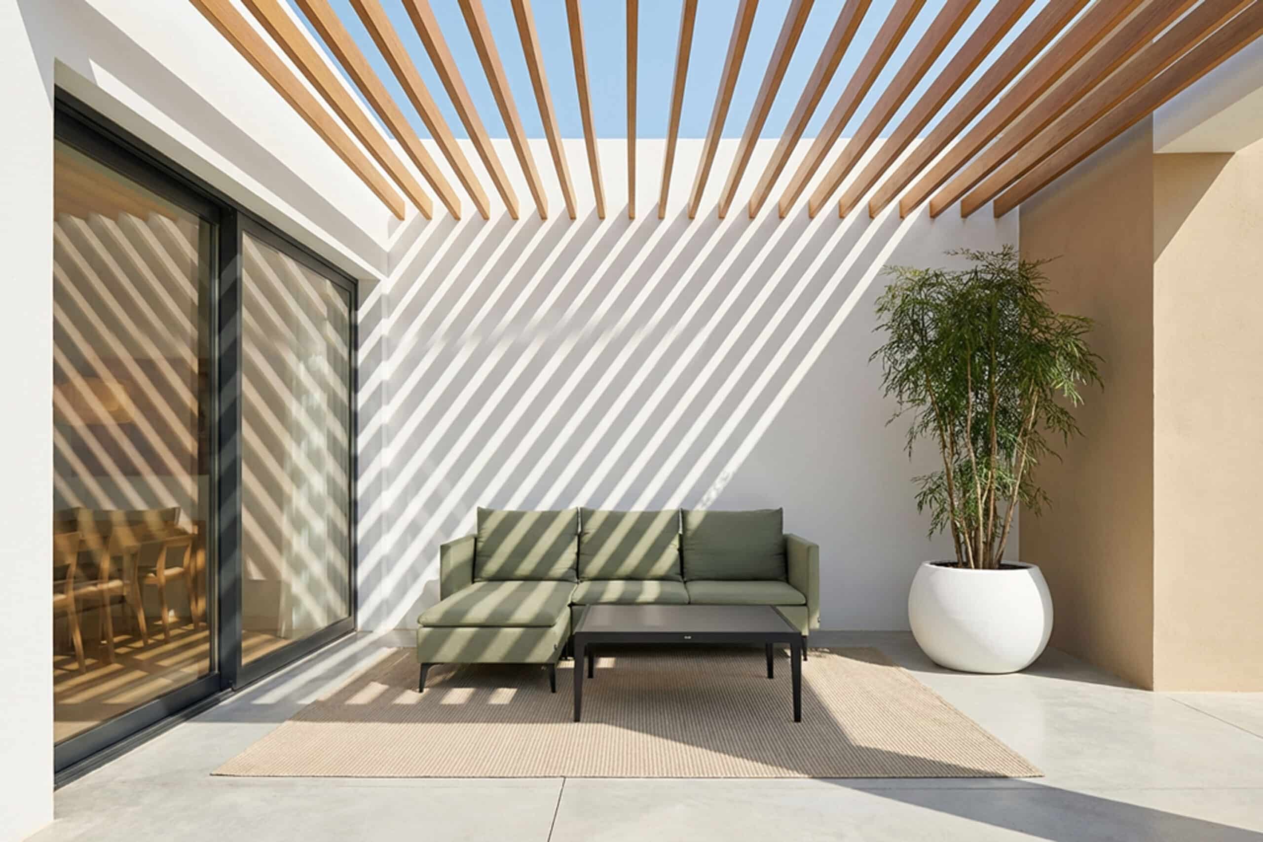 Alle puter er trukket i Sunbrella almond — en dempet salvie-grønn med olivenundertone som spiller godt mot det sortlakkerte aluminiumet. Skummet i setene er vanndrenerende, noe som gjør at gruppen tørker raskt etter regn og er klar til bruk igjen på kort tid. Tekstilet er enkelt å tørke av og har fem års garanti mot solfalming. Vanger og rygg kan tas av, noe som gjør rengjøring og eventuell oppbevaring enklere. Sett opp gruppen en gang — og la den stå.