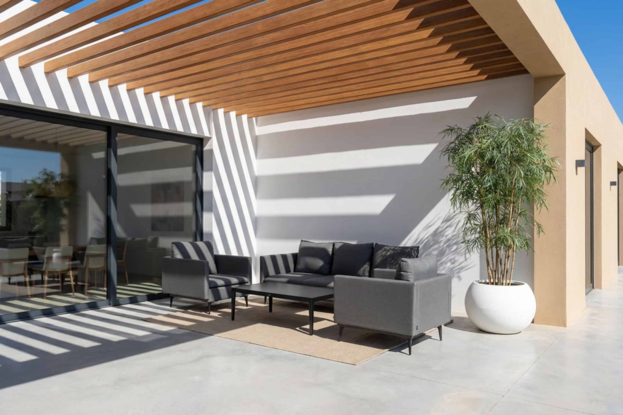 Hunter sofagruppe består av en romslig 3-seter, to sofastoler og et sofabord med bordplate i keramisk flis — alt i sortlakkert aluminium som aldri ruster og holder seg pent sesong etter sesong. Gruppen er dimensjonert for å sitte lenge, og de brede setene gir god plass uten at møblene virker tunge i uttrykket.