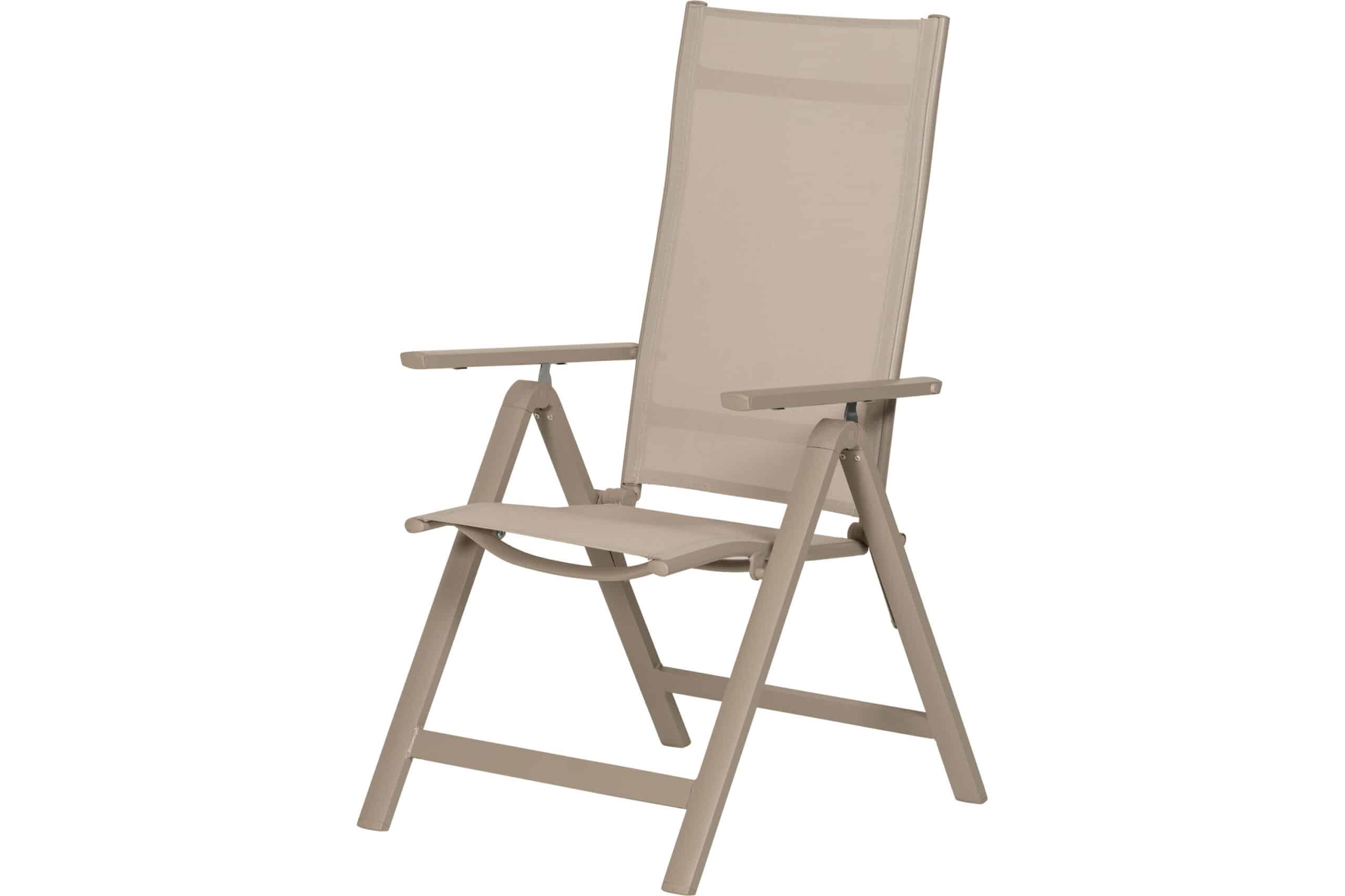Rammen er laget i aluminium som er lett i vekt og enkel å flytte. Sete og rygg er trukket i textilene i samme sandfarge. Materialet er luftig og slitesterkt, og gir behagelig støtte uten at du trenger puter. Stolen kan klappes sammen når den ikke er i bruk, noe som gjør den enkel å lagre.
