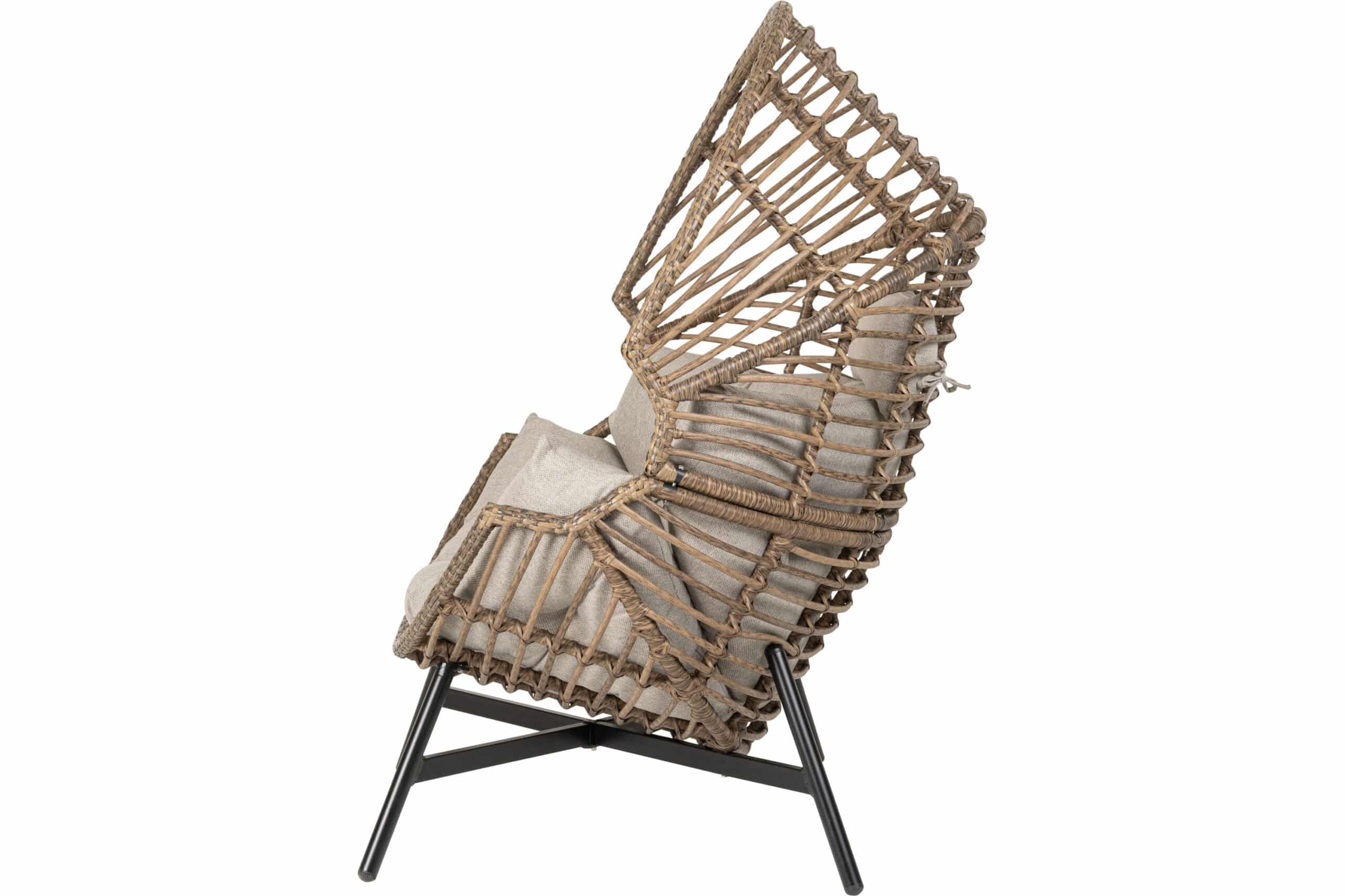 Jamaica kurvstol er en sjarmerende og komfortabel kurvstol. Med sitt særegne design blir den garantert et blikkfang i ditt uterom. Stolen er laget av kubu-farget kunstrotting, elegant flettet på en solid ramme av sort pulverlakkert aluminium. De myke putene er kledd i et behagelig tekstil av naturfarget spun-polyester, og er med på å gjøre stolen til en innbydende oase for avslapning – perfekt for å nyte en kopp kaffe eller fordype seg i en god bok.