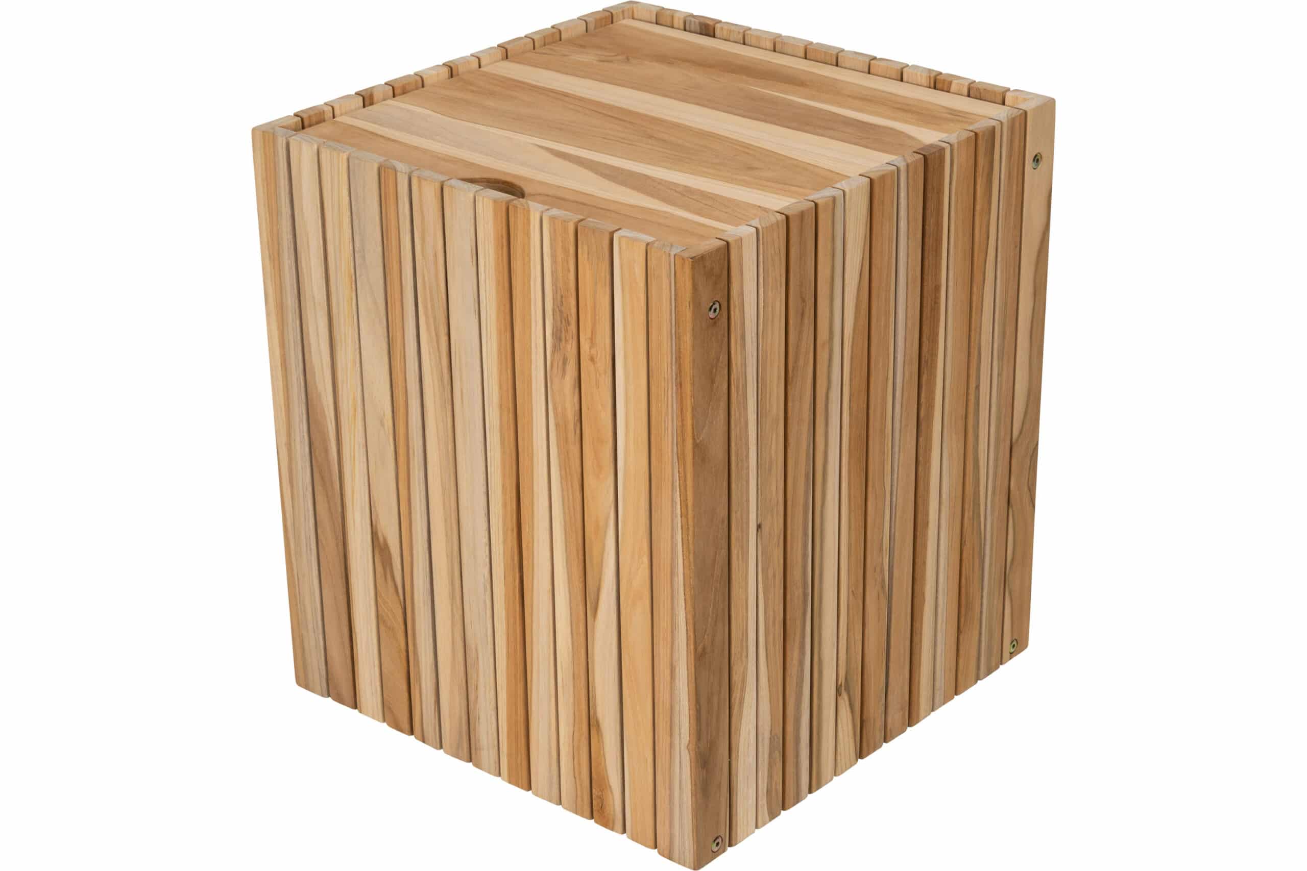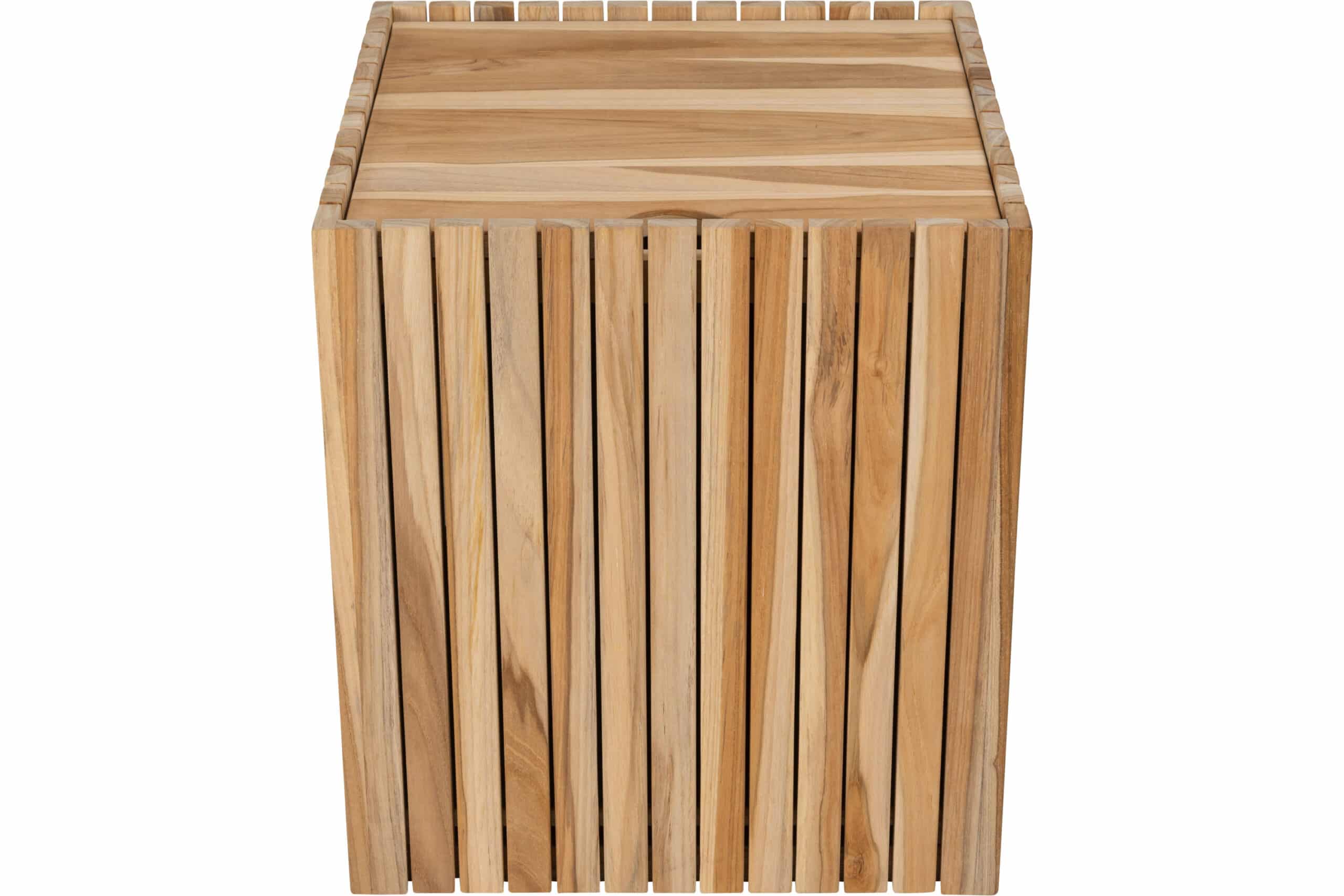 Denne stilrene skittentøyskurven i teak er laget for deg som ønsker en funksjonell løsning som også ser bra ut på badet. Den kubiske formen gir et ryddig og harmonisk uttrykk, og gjør den enkel å plassere både på bad, soverom eller vaskerom.