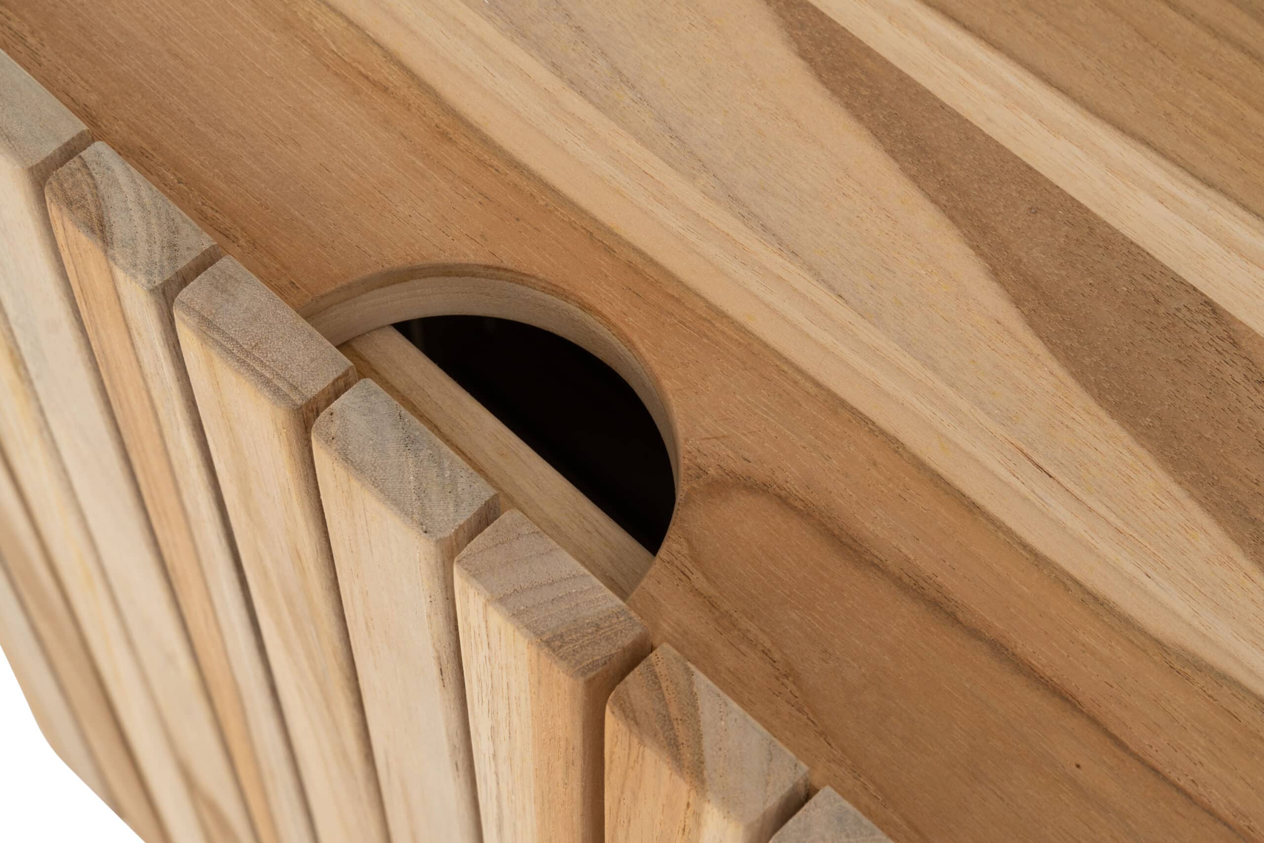 Kurven har fast bunn og et praktisk lokk som vippes opp, slik at skittentøyet skjules på en elegant måte. Teak er et treslag som er naturlig motstandsdyktig mot fukt, og egner seg derfor svært godt til bruk i rom med høy luftfuktighet. Over tid vil treverket utvikle en vakker, naturlig patina.