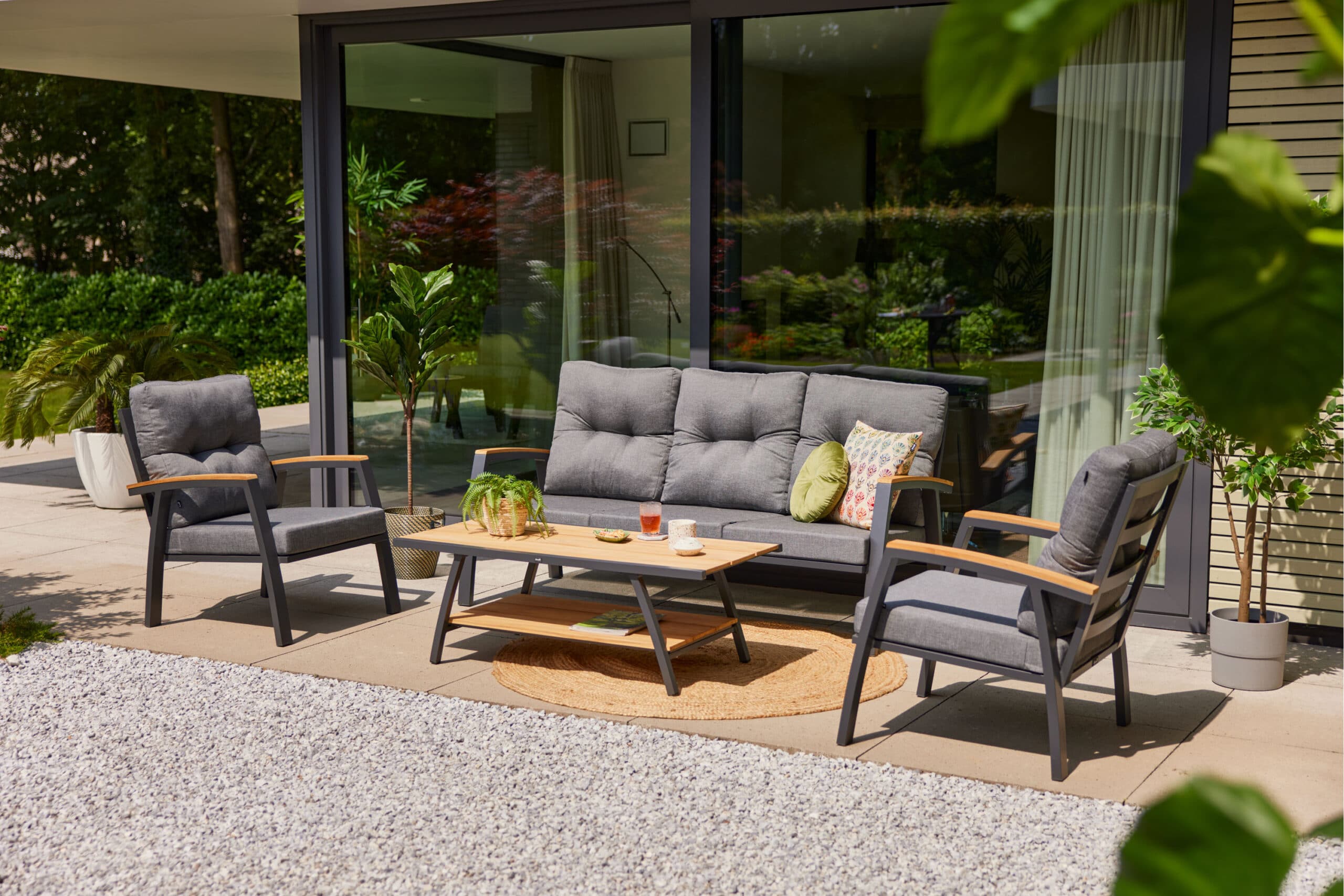 Stefano 3-seter sofagruppe 3+1+1 gir deg en komplett sittegruppe som er både praktisk og stilren. Med en ramme i grålakkert aluminium kan du være trygg på at den ikke ruster, og den er lett å flytte rundt på terrassen etter behov. De inkluderte putene er trukket i Olefin, et slitesterkt tekstil og holder fargen gjennom flere sesonger. Putene bør oppbevares tørt når det ikke er i bruk for lengre levetid.